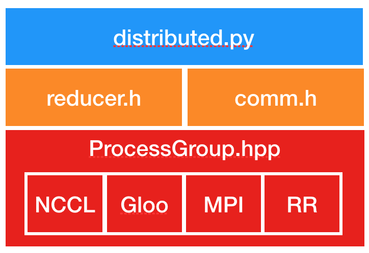 c10dlibrary provides 3 implementations out of the box, namely, ProcessGroupGloo, ProcessGroupNCCL, and ProcessGroupMPI.DistributedDataParallelusesProcessGroup::broadcast()to send model states from the process with rank 0 to others during initialization andProcessGroup::allreduce()to sum gradients.Store.hpp: assists the rendezvous service for process group instances to find each other.