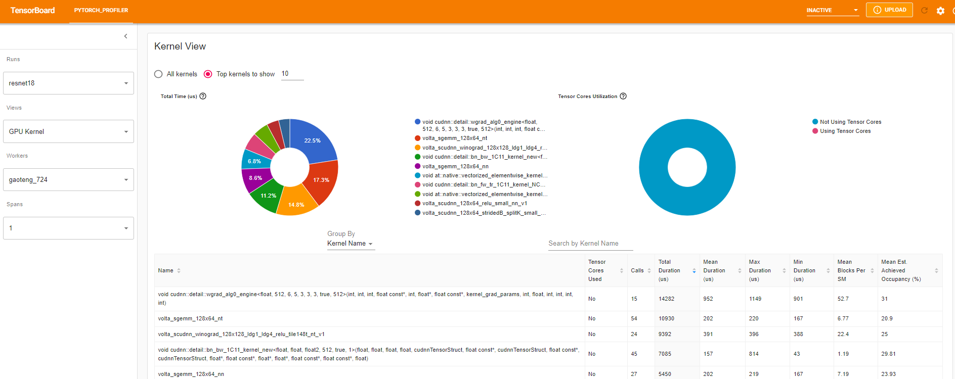 The GPU kernel view shows all kernels’ time spent on GPU.