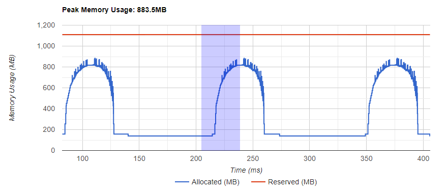 The memory curve shows the trends of memory consumption. The “Allocated” curve shows the total memory that is actually in use, e.g., tensors. In PyTorch, caching mechanism is employed in CUDA allocator and some other allocators. The “Reserved” curve shows the total memory that is reserved by the allocator. You can left click and drag on the graph to select events in the desired range: