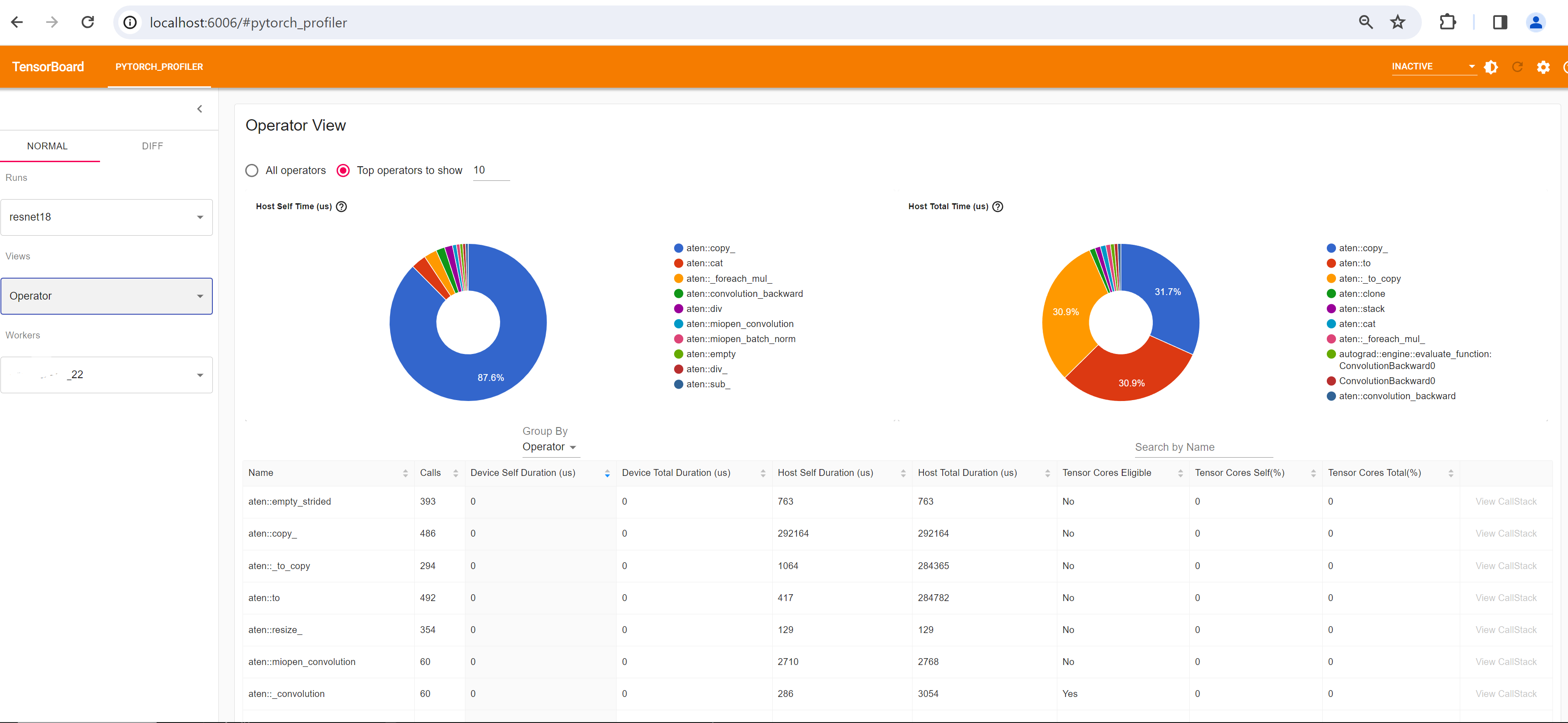 The operator view displays the performance of every PyTorch operator that is executed either on the host or device.